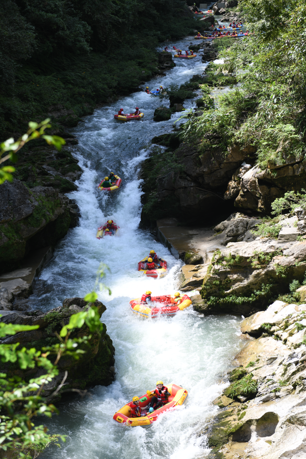 漂流全程络绎在原始森林掩盖的深山峡谷之中,两岸植被茂盛,古木参天,藤蔓垂挂,怪石嶙峋,常有飞瀑流泉从崖壁飞泻而下,风光雄奇绚丽。长达5公里、落差逾200米的漂流河道中,精心设计的险滩与陡峭区域交织散布,让游客在心跳加快与放松赏景间自若切换,充沛领会“水在石上淌,人在画中游”的美妙意境。漂到陡峭的河段,游客们有的赏识两岸如画的景色,有的打起影响的水仗,有的在深潭里游水戏水,有的到沿途设置的小吃摊品味美食。
