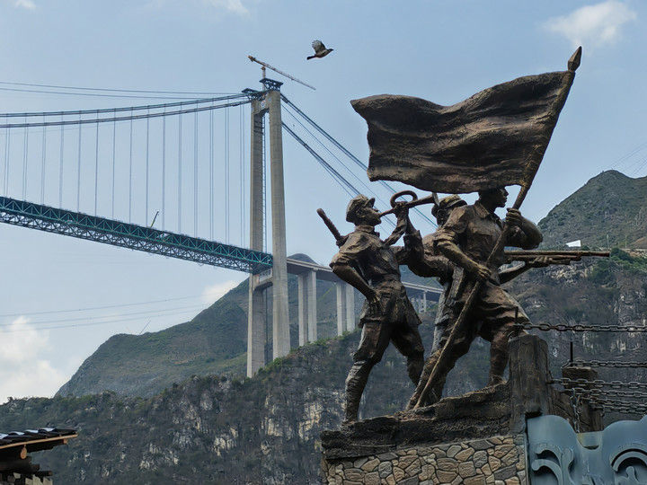 这是2025年4月28日拍照的贵州花江峡谷大桥。9月28日,新的国际榜首高桥——贵州花江峡谷大桥建成通车。近处的则是一座建于1898年、由14根铁链组成的花江铁索桥。1935年4月,中心赤军右路纵队前进黔西南,死守花江铁索桥这一战略要冲,保证赤军主力顺畅抢渡北盘江。新旧两座桥,横跨着百年前史风云,见证着血与火的艰苦进程。
