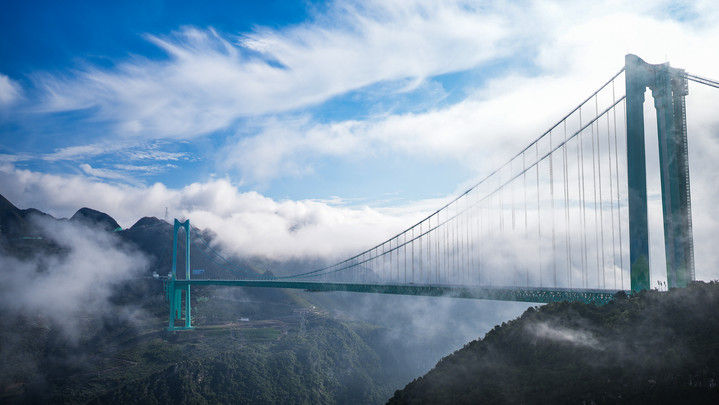 2025年9月28日,国际榜首高桥——贵州花江峡谷大桥建成通车。花江峡谷大桥是贵州六枝至安龙高速公路的控制性工程,大桥全长2890米,主跨径1420米,是现在国际山区峡谷榜首大跨度钢桁梁悬索桥;其桥面距水面笔直高度625米,是新的国际榜首高桥。