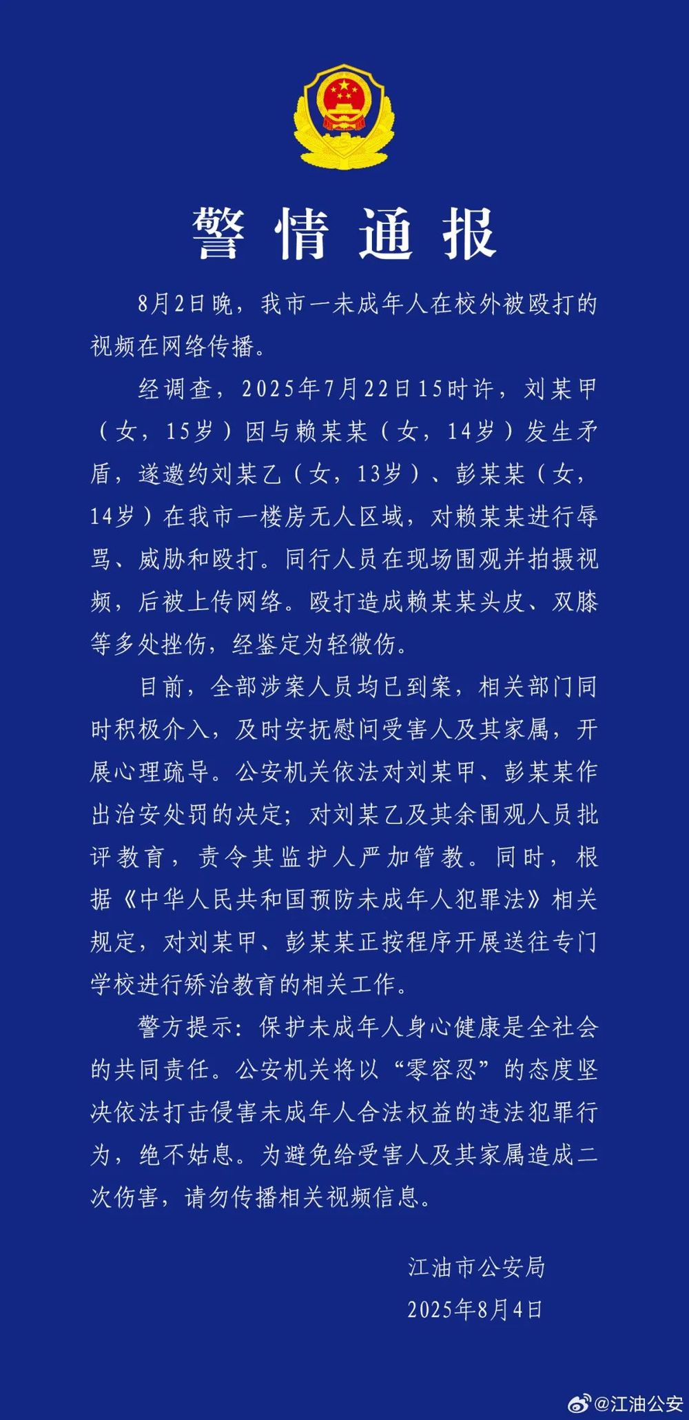 · 8月4日,四川江油警方通报“14岁女孩校外被殴伤”处理结果:2人被治安处罚并送往专门校园进行矫治教育。